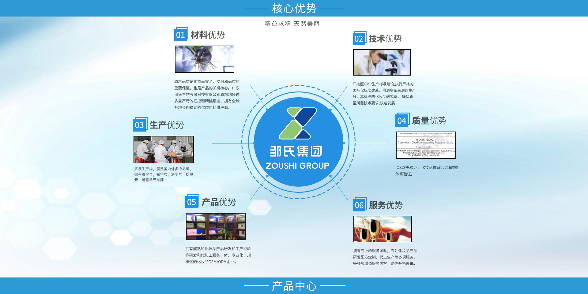 廣東鄒氏生物科技股份有限公司是一家集原料研制、配方開發、加工生產及配套性服務為一體的全球化化妝品OEM/ODM服務企業。鄒氏生物秉承“精益求精,天然美麗”的經營理念,始終孜孜不倦的在美業領域深耕,經過不斷發展完善與技術提升,在行業內頗具口碑和影響力。公司擁有雄厚的資金實力、先進的生產設備以及大批高精專的人才儲備,旨在打造一個純自主研發,純自主生產以及管理的高科技日用美妝OEM/ODM品牌。